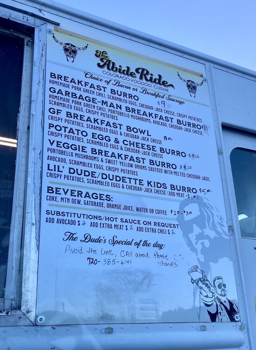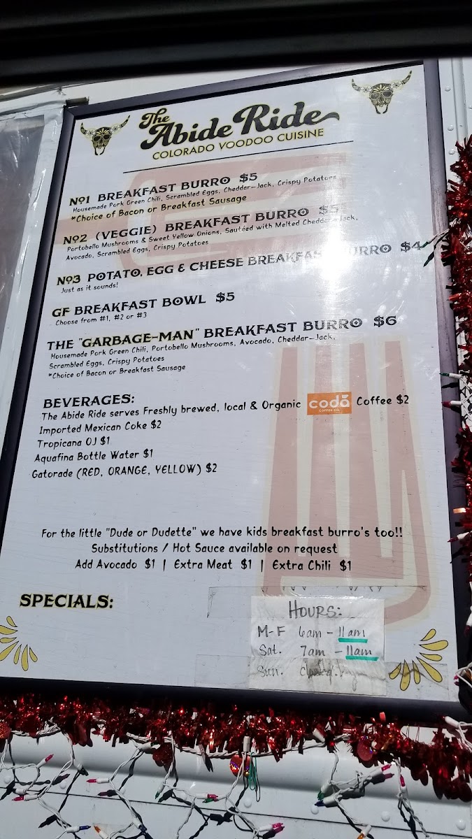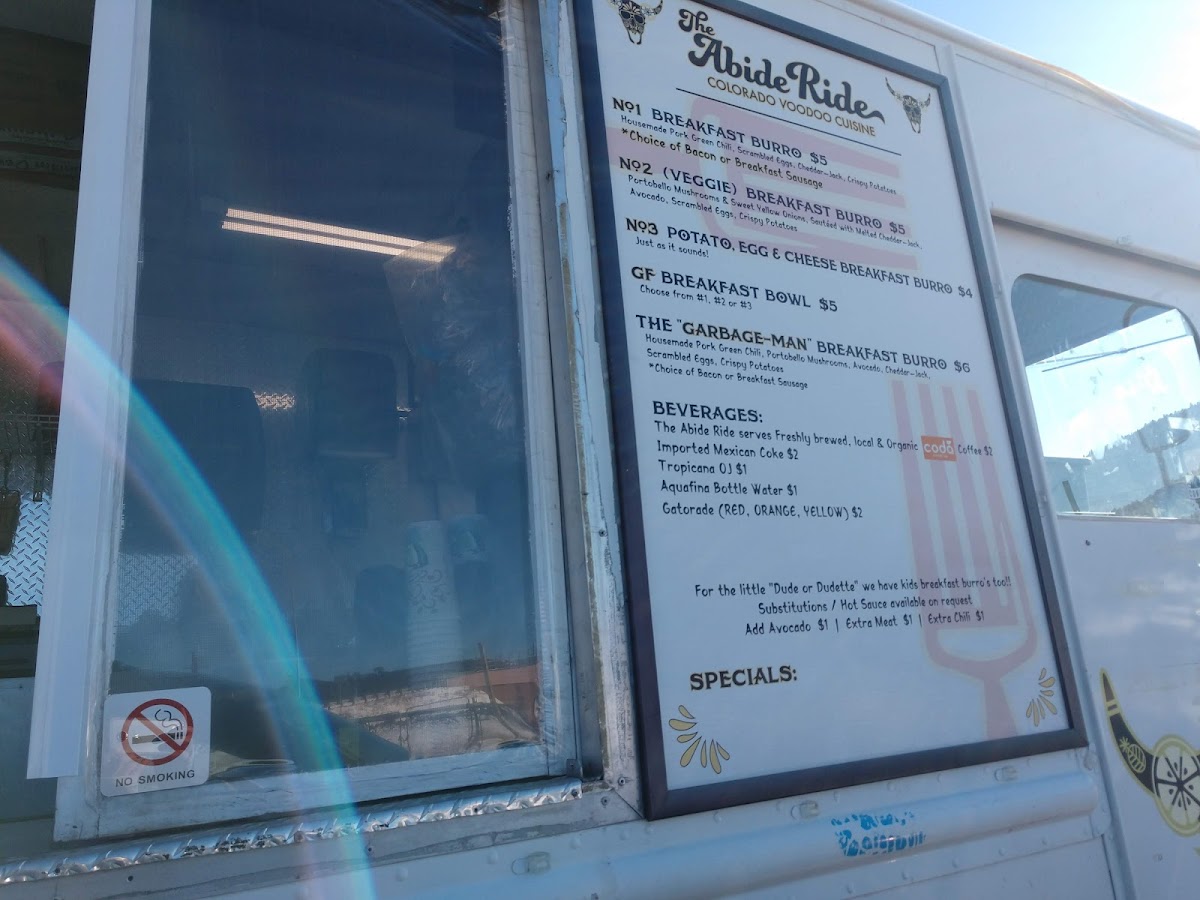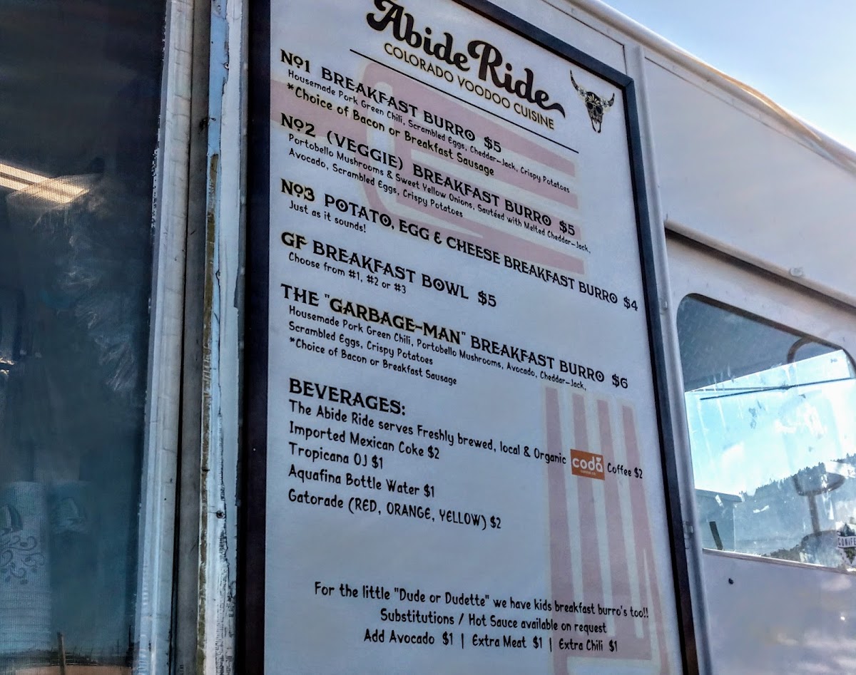 Welcome to The Abide Ride, a delightful food truck nestled in Conifer, CO, known for its exceptional breakfast burritos. For those passing through, this hidden gem is a must-stop for flavorful, freshly made dishes. The menu offers a satisfying range of burritos, including the fan-favorite Garbage Man Burrito featuring crispy bacon and savory mushrooms. Customers praise the delicious, homemade green chili sauce that enhances the flavor without overpowering the palate.